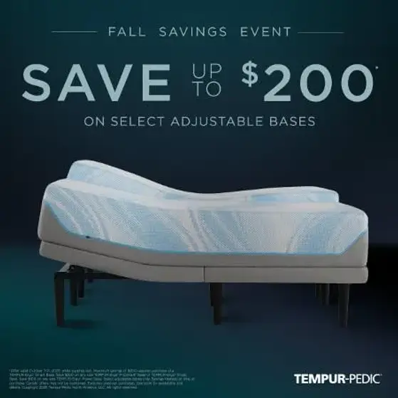 *Offer valid October 7-21, 2025, while supplies last. Maximum savings of $200 requires purchase of a TEMPUR-Ergo* Smart Base. Save $200 on any size TEMPUR-Ergo* ProSmart® Base or TEMPUR-Ergo® Smart Base. Save $100 on any size TEMPUR-Ergo® Power Base. Select adjustable bases only. Savings realized at time of purchase. Certain offers may not be combined. Excludes previous purchases. See store for availability and details. Copyright 2025 Tempur-Pedic North America, LLC. All rights reserved.