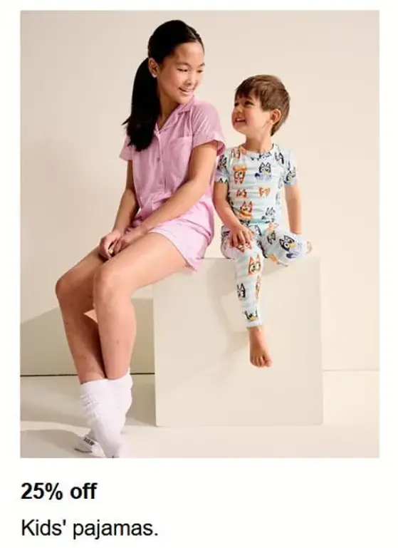 Hurry! Shop in store and get 25% off on kids' pajamas.