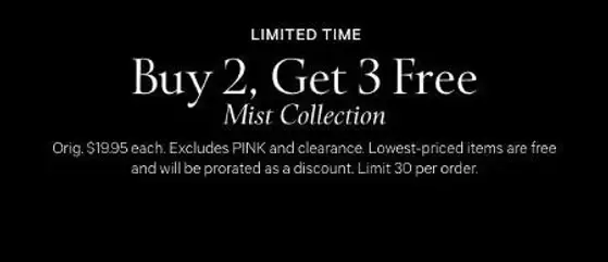 Limited time! Shop in store and enjoy buy 2, get 3 free on mist collection.