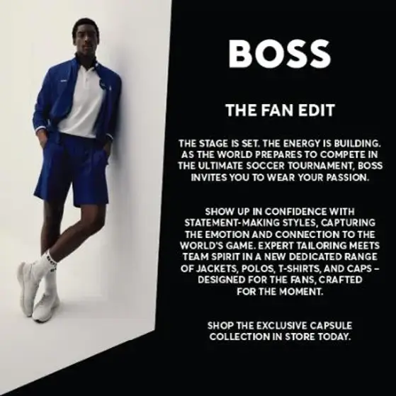 SHOW UP IN CONFIDENCE WITH STATEMENT-MAKING STYLES, CAPTURING THE EMOTION AND CONNECTION TO THE WORLD’S GAME. EXPERT TAILORING MEETS TEAM SPIRIT IN A NEW DEDICATED RANGE OF JACKETS, POLOS, T-SHIRTS, AND CAPS – DESIGNED FOR THE FANS, CRAFTED FOR THE MOMENT.