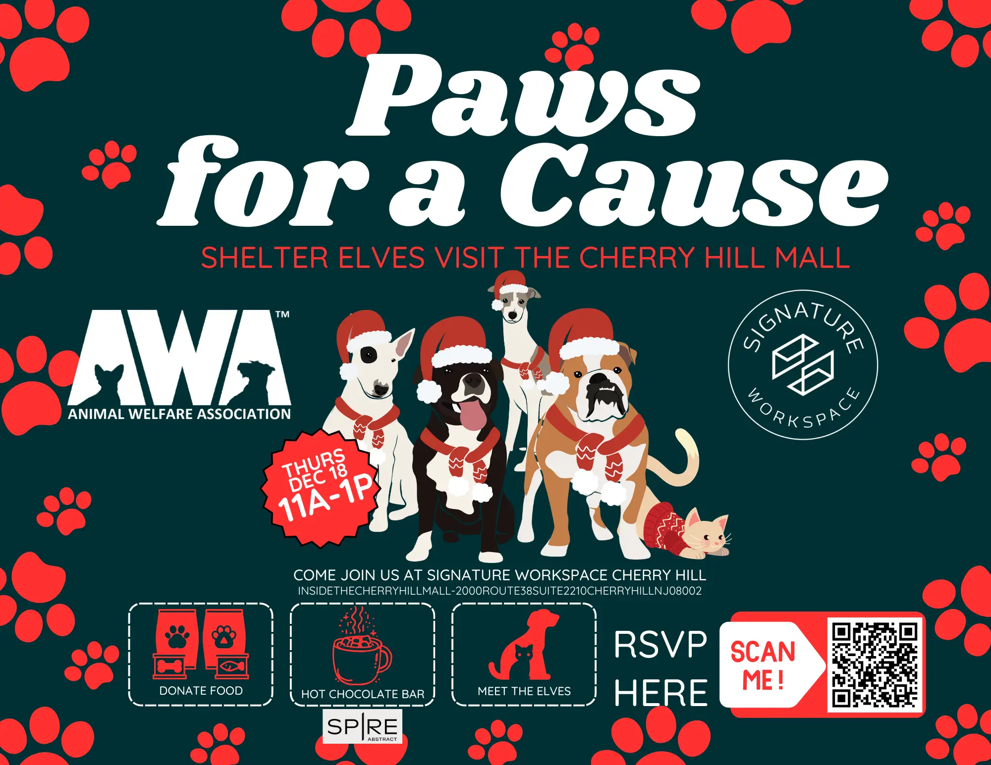 Join us for a heartwarming morning as we welcome the adorable AWA Shelter Elves to Signature Workspace for our FIRST annual Shelter Pet Giving Tree. Guests can meet adoptable pets, snap festive photos, enjoy light treats, and help us make a meaningful impact by donating the final items needed for the AWA Animal Shelter. Come share the magic, wagging tails, and feel-good moments because every act of kindness helps a furry friend in need.