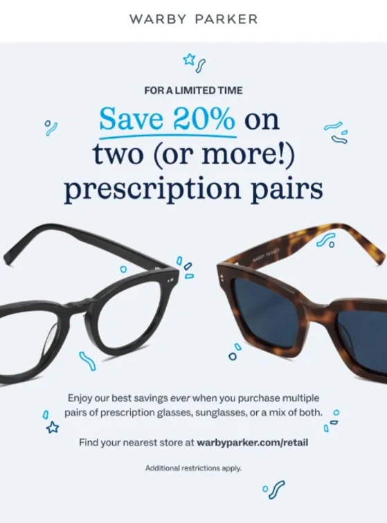 Save 20% on two or more prescription pairs.
